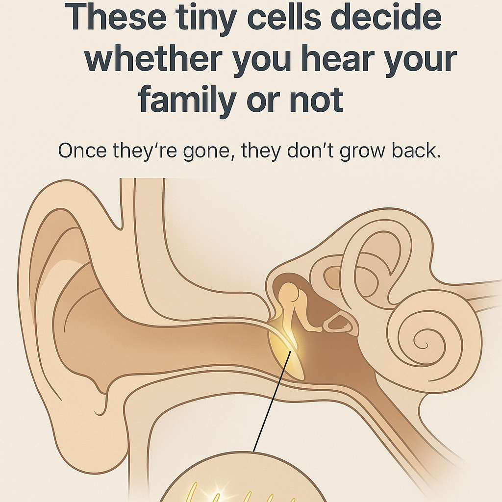 Sound hits your eardrum. Gets amplified by three tiny bones. Converts into waves in a fluid-filled spiral called the cochlea. Then—and here's where it gets interesting—thousands of microscopic hair cells with even tinier filaments called stereocilia convert those waves into electrical signals your brain understands as sound. Those stereocilia? They're dying. Right now. As you read this. They break. They bend. They snap off like dead tree branches in a storm. And unlike every other cell in your body, they DON'T grow back. So year after year, you have fewer and fewer of these little guys working. Which means your brain gets less and less information. Which means you hear less and less of the world around you. That's why your grandson's voice sounds like mumbling. Why restaurant conversations feel like trying to hear someone whisper in a windstorm. Why you've given up on phone calls entirely. Your stereocilia are gone. And they're not coming back.