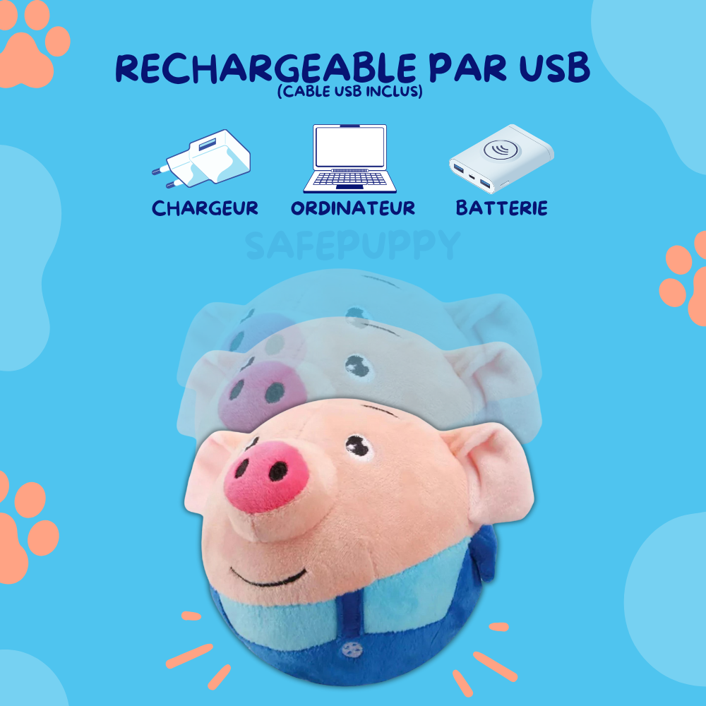 The Bouncing Pig is equipped with a USB rechargeable battery that can last up to 2 days of fun for your pooches! It also comes with a complementary USB charging cable that can connect to any USB compatible device!