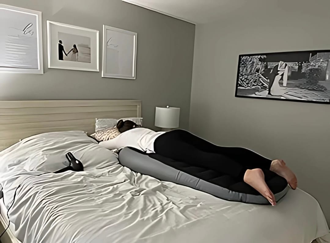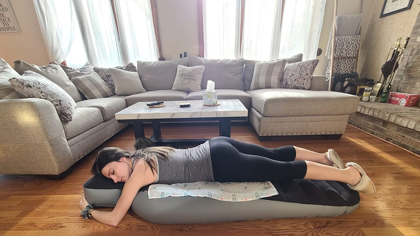 This inflatable pillow lets you lie face down comfortably, relieving back and belly pressure, enhancing relaxation, and supporting gentle exercises.