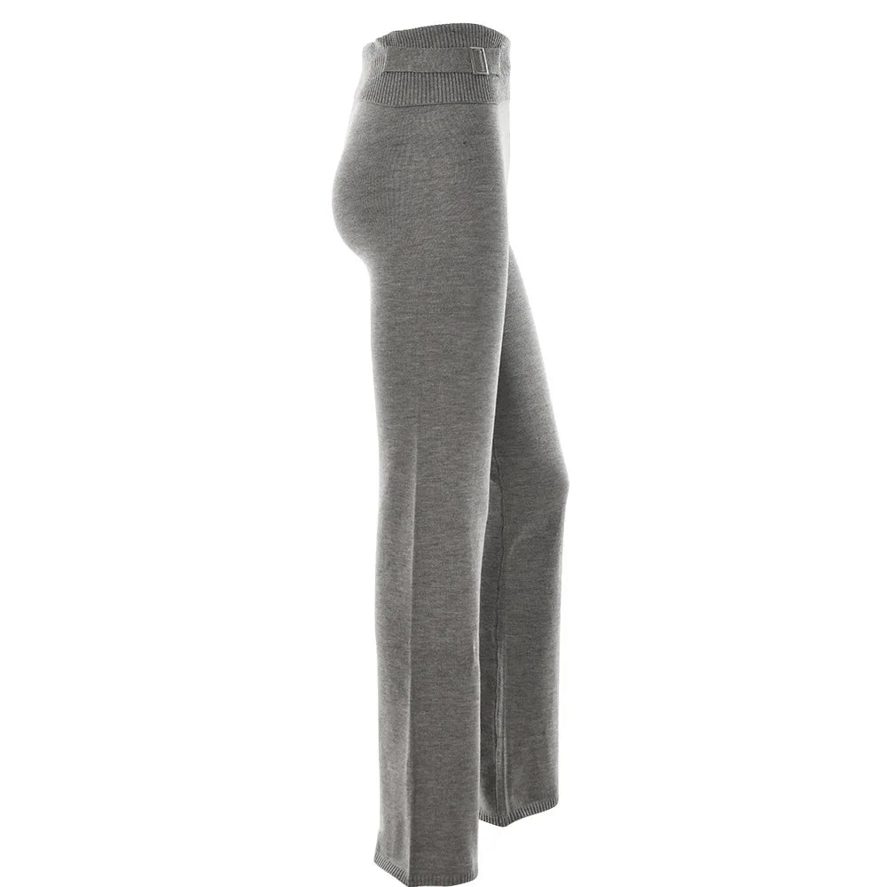 Die hüfthohen Hosen sehen aus jedem Blickwinkel toll aus, mit einem gerippten Bund, einer Schnallenverzierung, Strickstoff und ausgestellten Beinen.