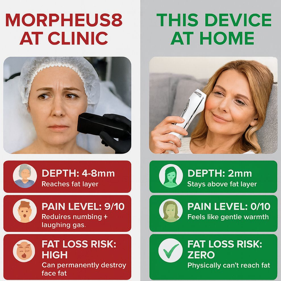 Yes. Because collagen production doesn't require trauma. It requires controlled thermal injury at the right depth. Professional devices go deeper because they're trying to treat severe laxity in ONE session. This treats moderate concerns over multiple gentle sessions. Different approach, same collagen remodeling result.